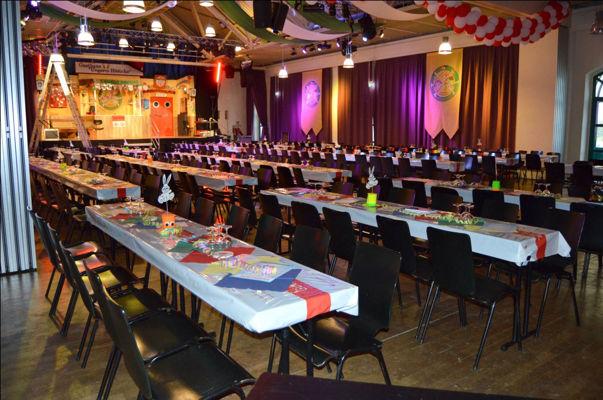 - Großer Saal – ca. 315 m² Parkett, geeignet für Veranstaltungen mit bis zu ca. 400 Personen (bestuhlte Veranstaltungen, Konzerte, Karneval, große Feiern).