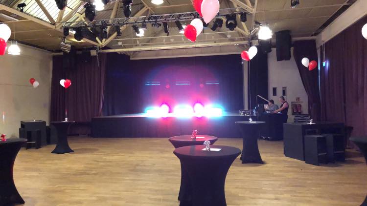 - Bühne & Technik – Bühne (ca. 24 m², erweiterbar), einfache Licht- und Tontechnik, Künstlergarderoben und Leinwand sind vorhanden.